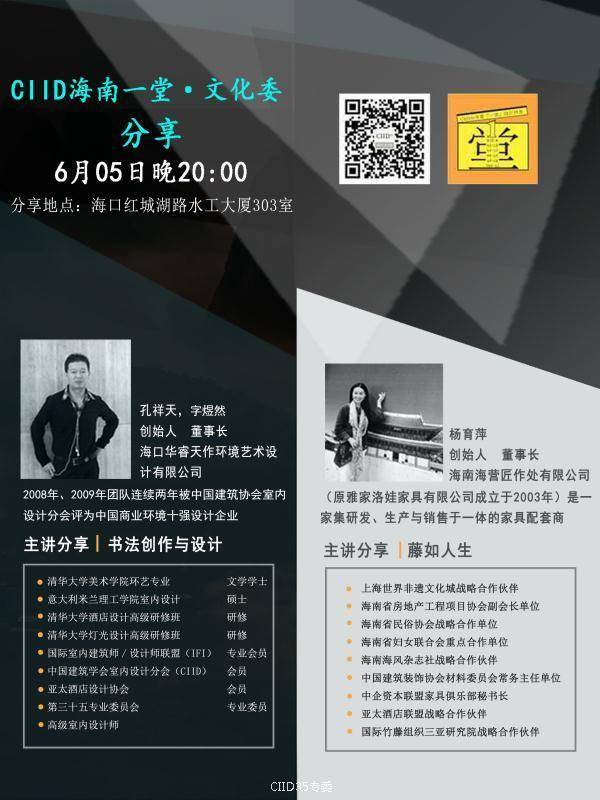 本期一堂互动主题“灵感来源于生活·创意来源于坚持”。6月5日20:00,CIID海南专委(文化委)委员、华睿天作设计创始人孔祥天《书法创作与设计》。海南海营匠作处有限公司创始人杨育萍《藤如人生》,又将为大家讲述怎样的精彩纷呈的生活感悟。