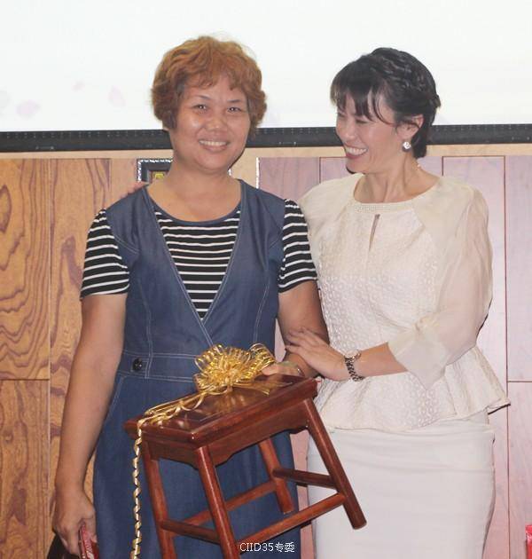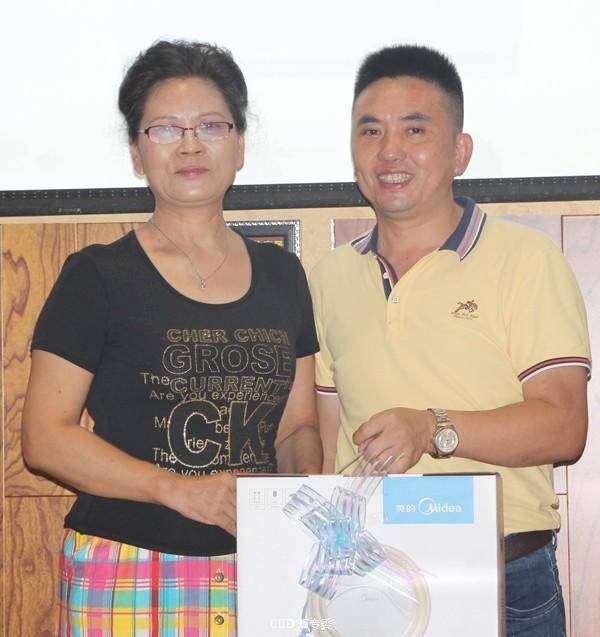 图为:帝亚整体家居总经理杨秀英为老客户赠送礼品