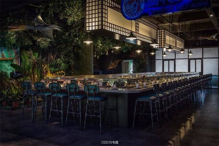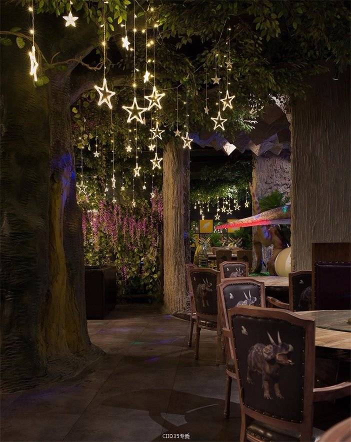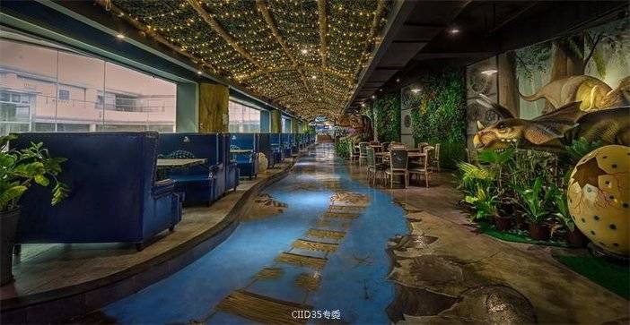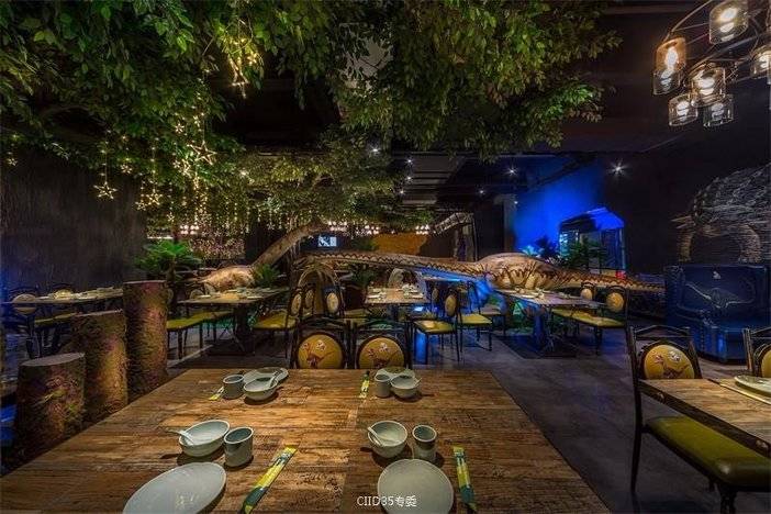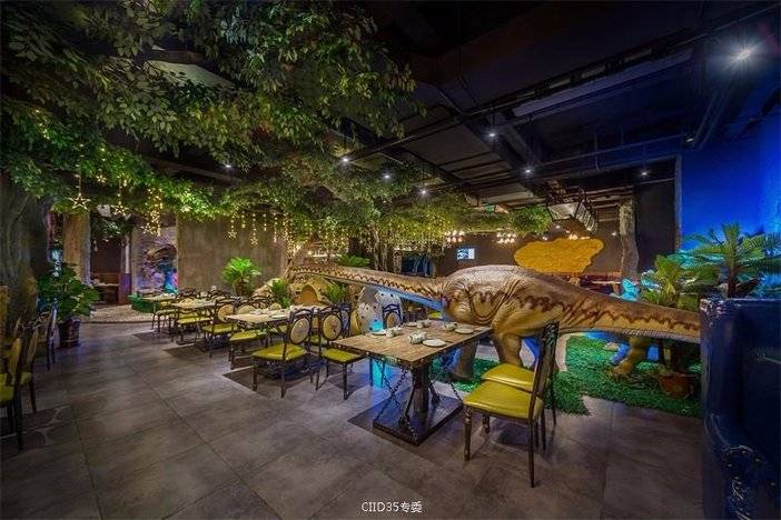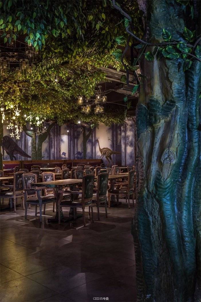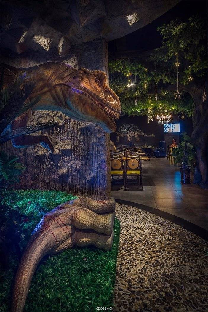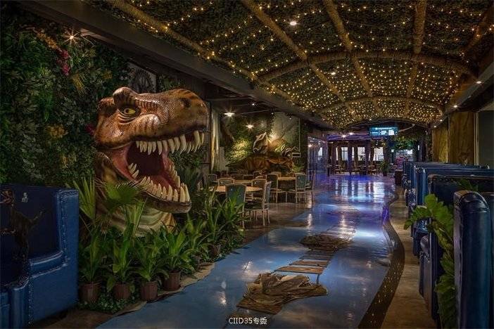 以恐龙生活的原始森林作为大场景:有大量的植物造景,内饰的墙壁也是仿石壁,上面挂着各种恐龙生物化石图案,极其逼真,探险的气氛很浓,恐龙的3D手绘也为里面增添一份梦幻色彩,沧海桑田只在转瞬之间,一个奇幻原始的侏罗纪时代把你带入了久违的大自然中。仿真恐龙模型,造型各异的恐龙摆件,奇趣可爱的恐龙蛋。里面的椅子也非常有调性,专门为餐厅定制,不同的区域印制了不同的恐龙图案。
