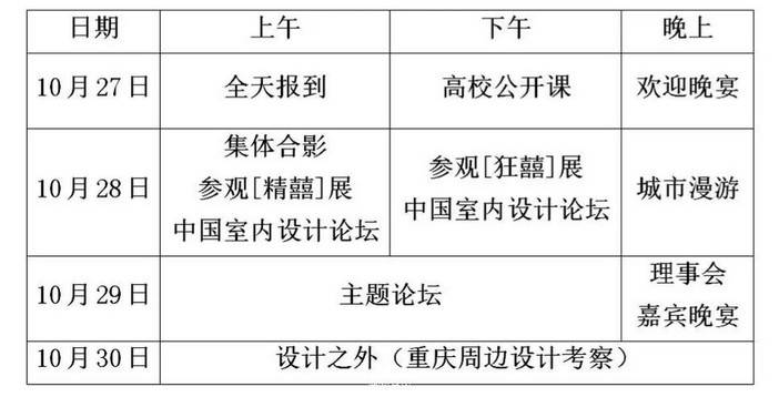 第四届中国室内设计艺术周暨2018第二十八届中国室内设计(重庆)年会将于20181027日—30日在重庆召开。这是室内设计界的盛事,也是广大室内设计师所期盼相聚的日子,我们热切期待着广大室内设计师踊跃报名参与,具体安排如下: